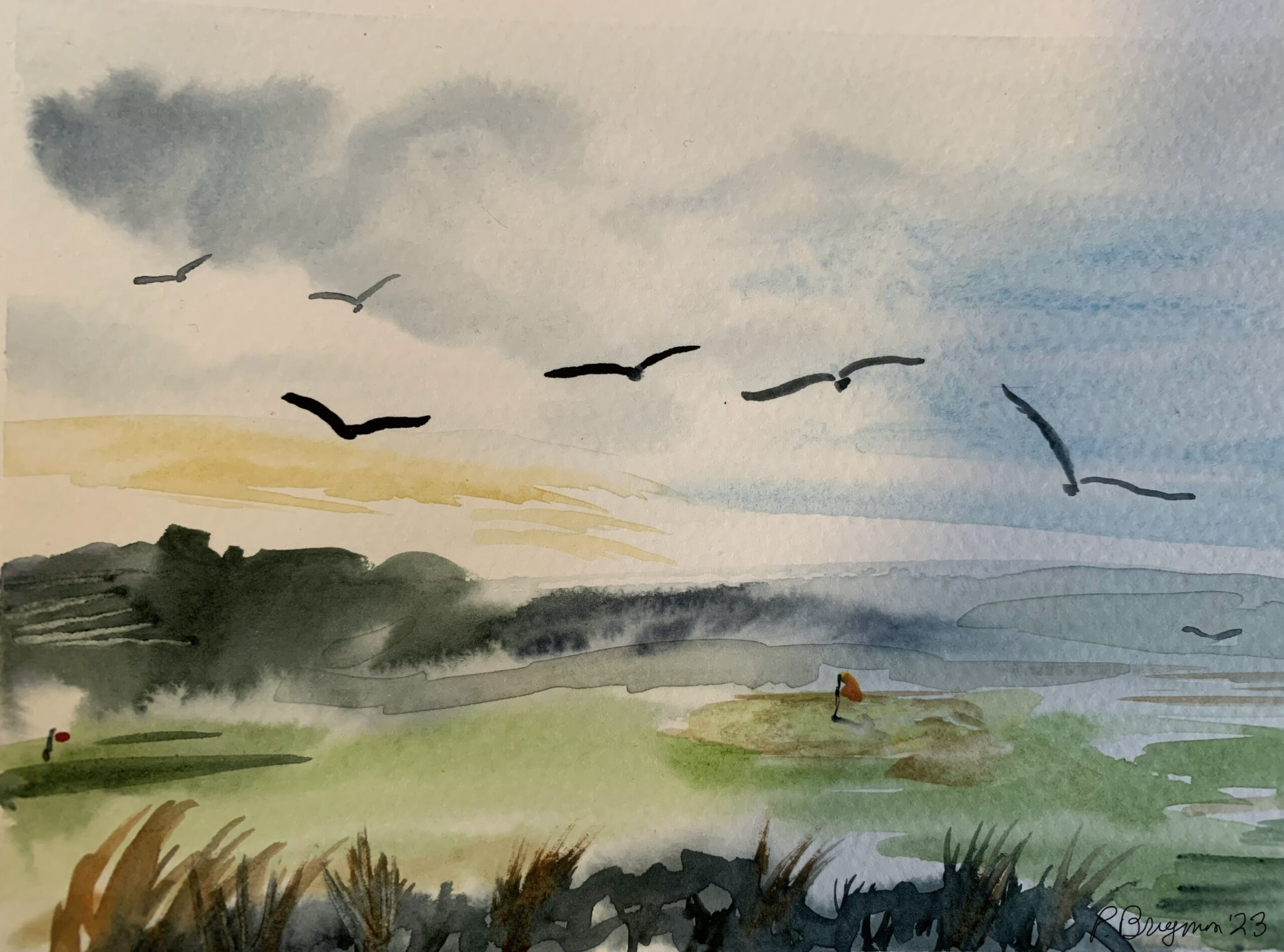 Today was “Reunion Day” with Peter, our third friend in Scotland (after Karen and Anne.) We met him on the Dunbar golf course ten years ago and always make it a point to see him once a trip, catch up on Scottish politics, his family, and golf! Sadly, his arms were recently injured so he wasn’t able to play but a few holes, but he walked around with us and none of us had a heart attack on 12 which is named “Hill ‘o Hope” for its steep walk up a grassy cliff! Apparently, a usual comment at the top is, “Where’s the defibrillator?”