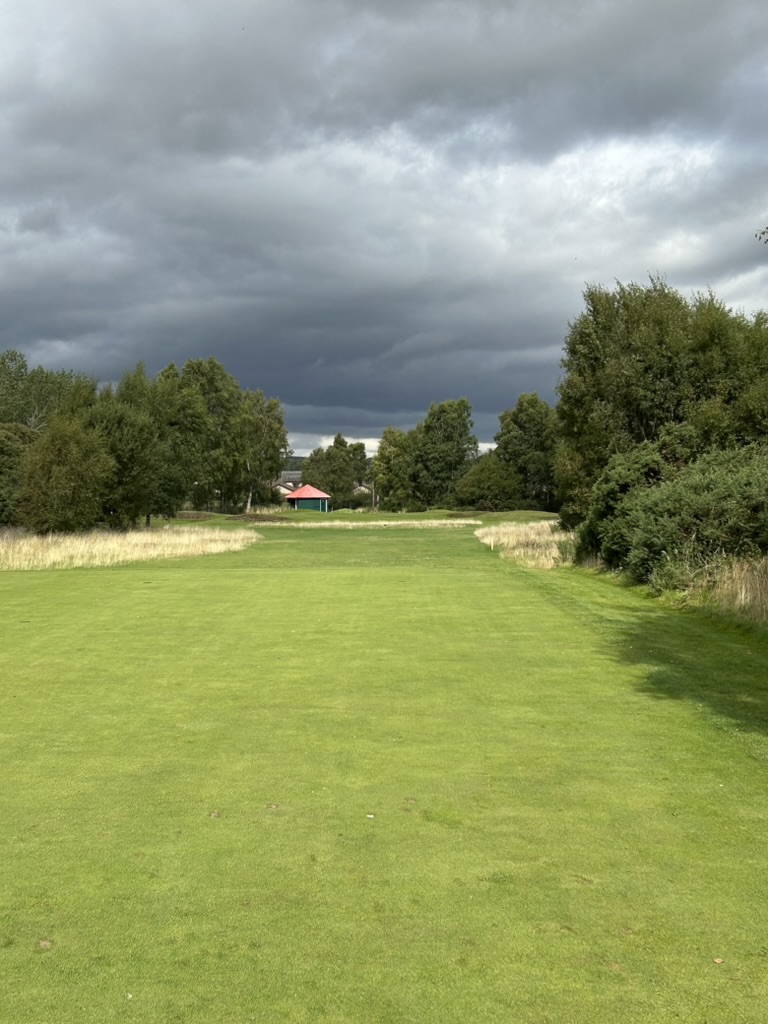 The Buddon Course is shorter, but beautiful and with a huge pond that comes into play on several holes. There are lots of thoroughly challenging par 3’s and just three par 5’s. A lovely course, really. And the pace of play was perfect— as was the weather. Big news, the sun was out and we both took off our jackets!  First time in two and a half weeks. So how Scottish then, that on the 18th tee box, the skies darkened with spits of rain. By the time we got to the green, it was sprinkling. By the time we putted out, we were digging for waterproofs. By the time we go to the clubhouse, we were running for cover!